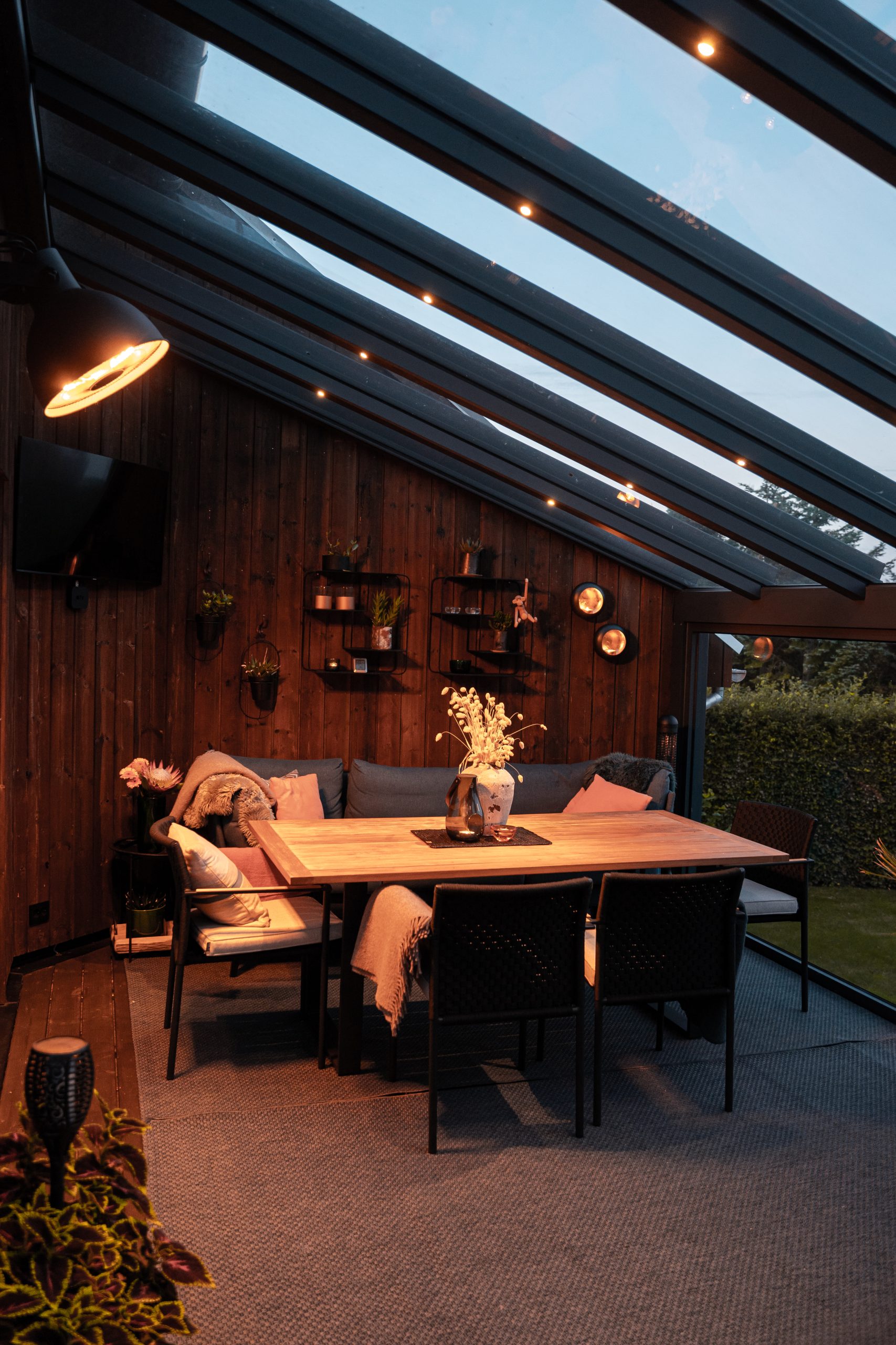 Nyt uteplassen også etter solnedgang med integrert LED-belysning. Effektiv, bærekraftig og enkel å styre – et trykk, og kvelden varer litt lenger.
