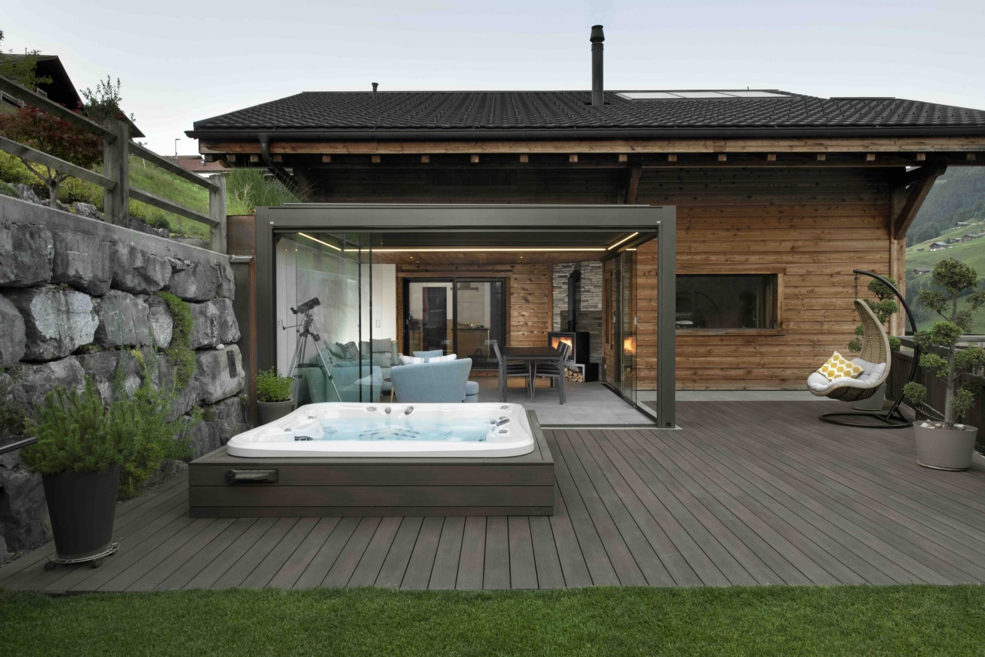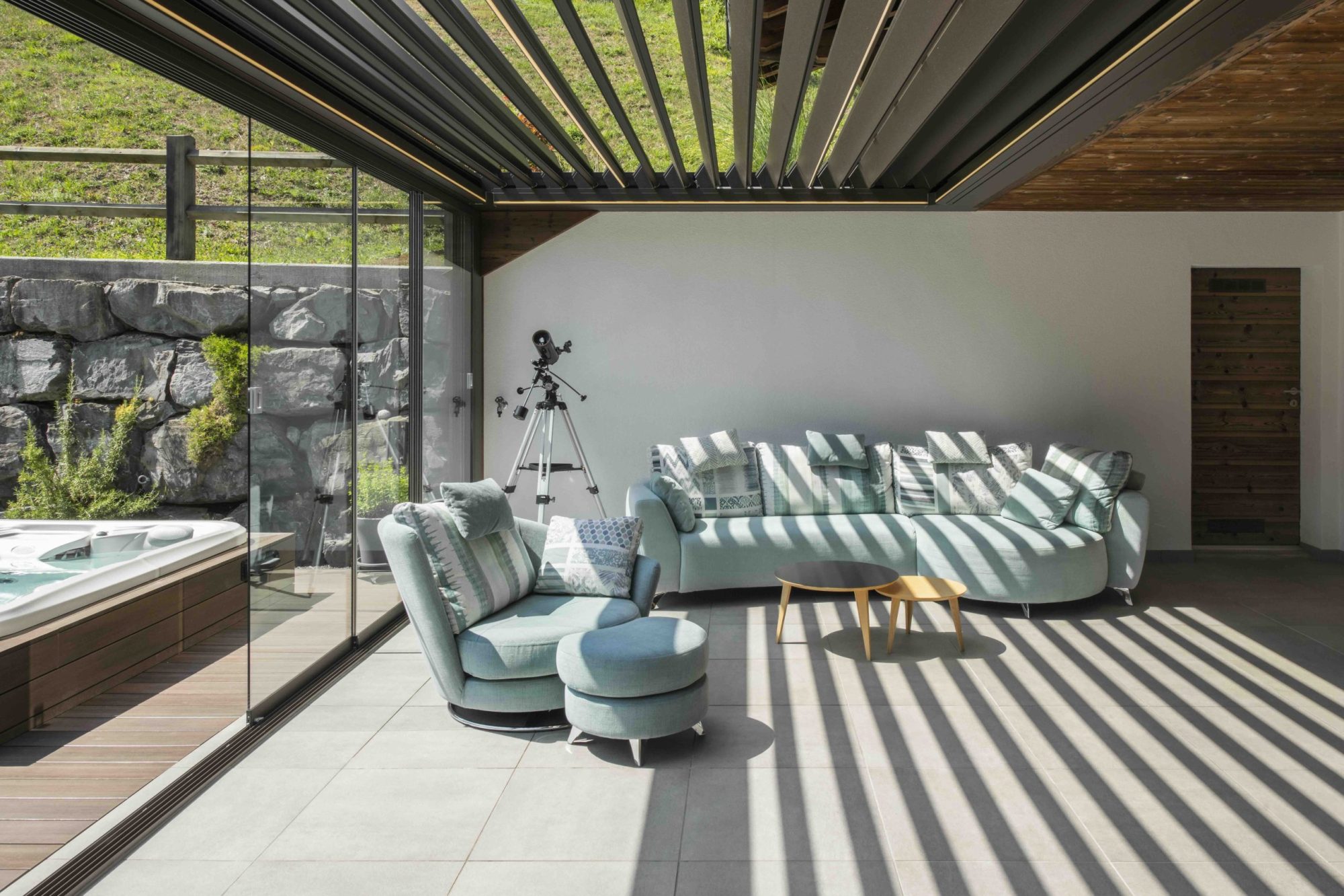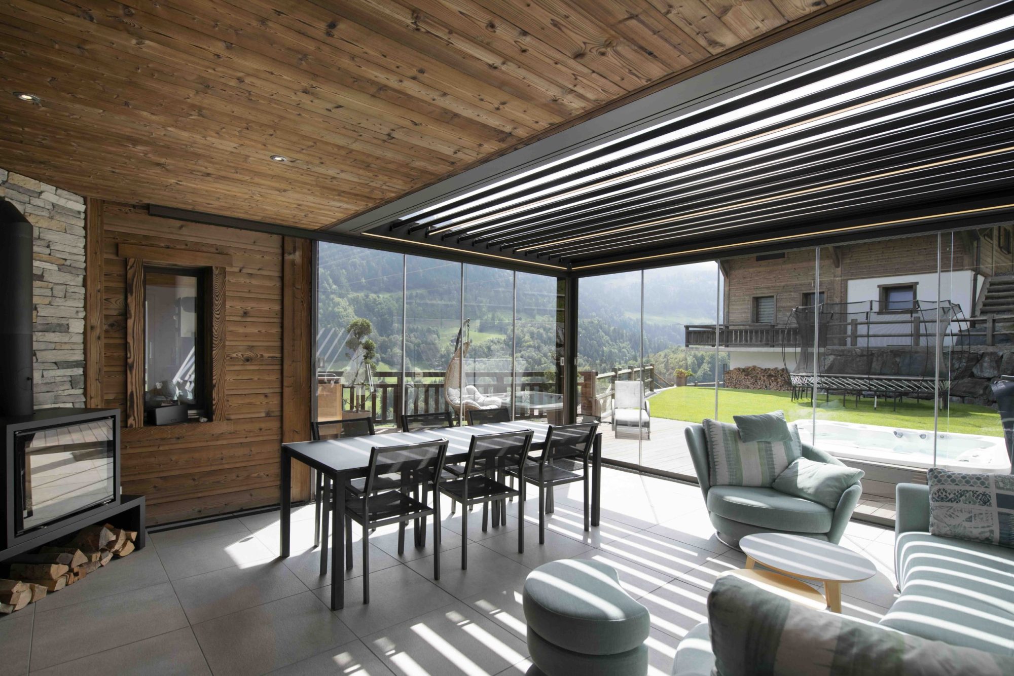 - Det kan lukkes med screens og skyvedører i glass
