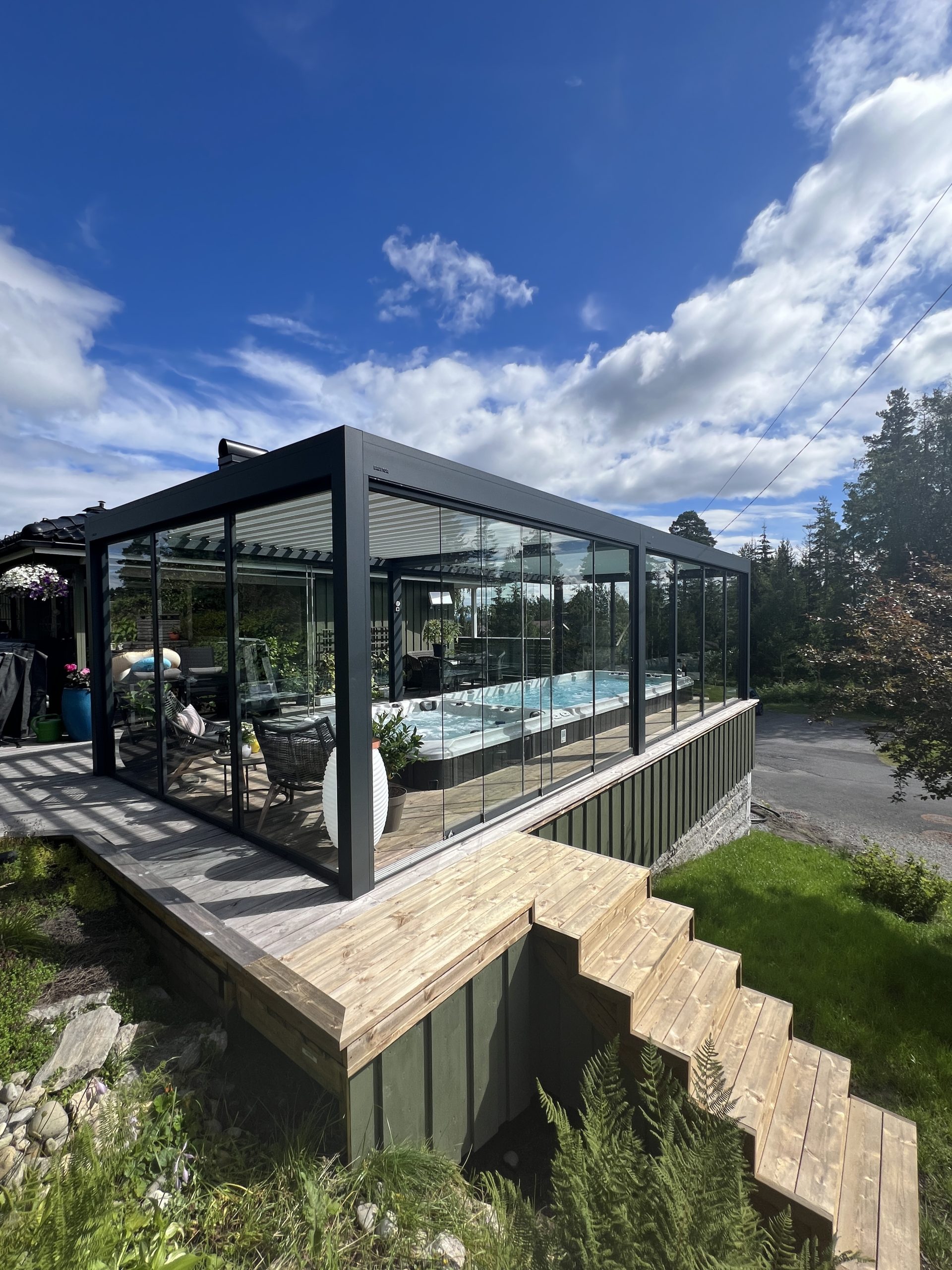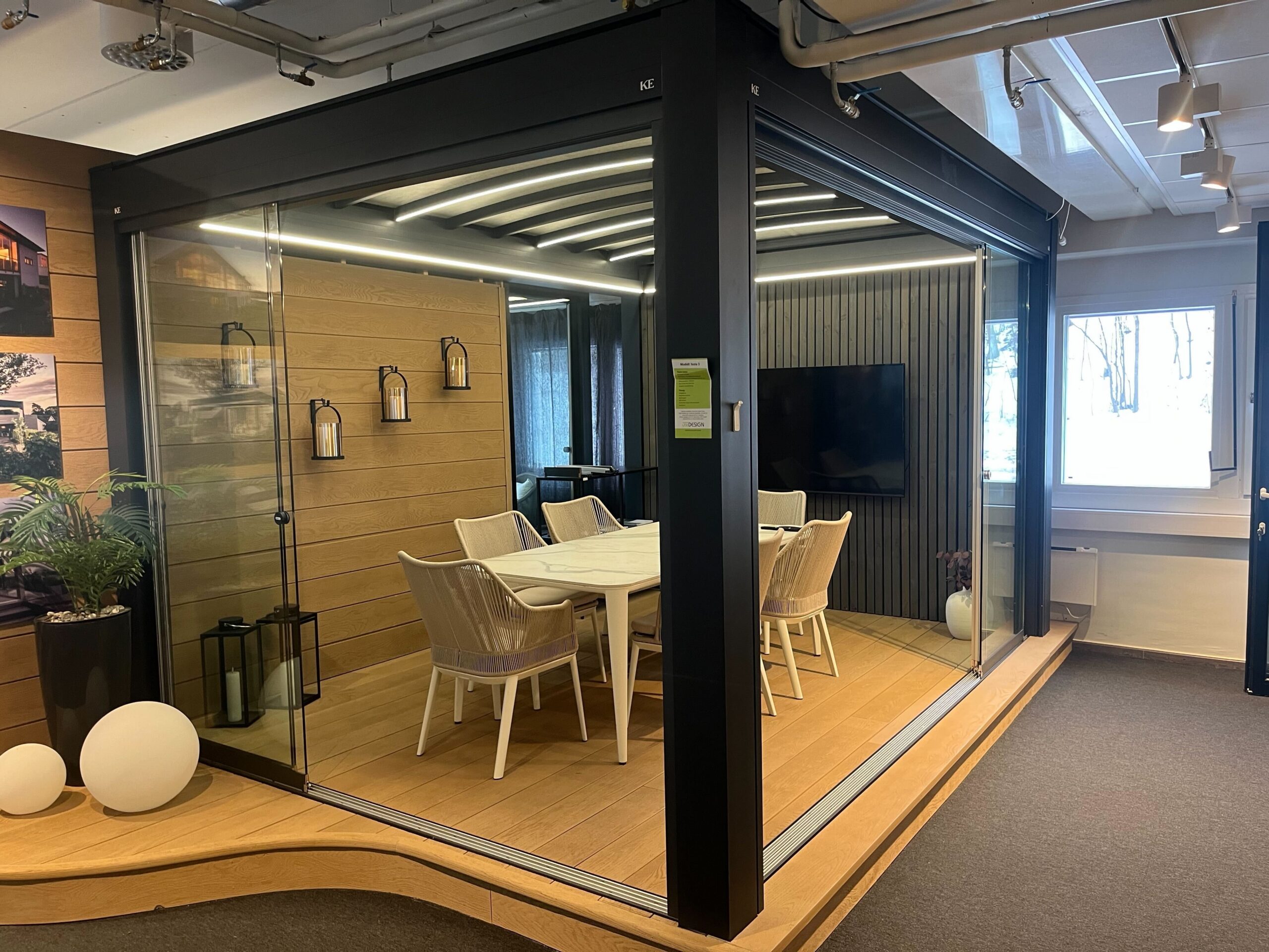 med skyveglass, fastglass og lys