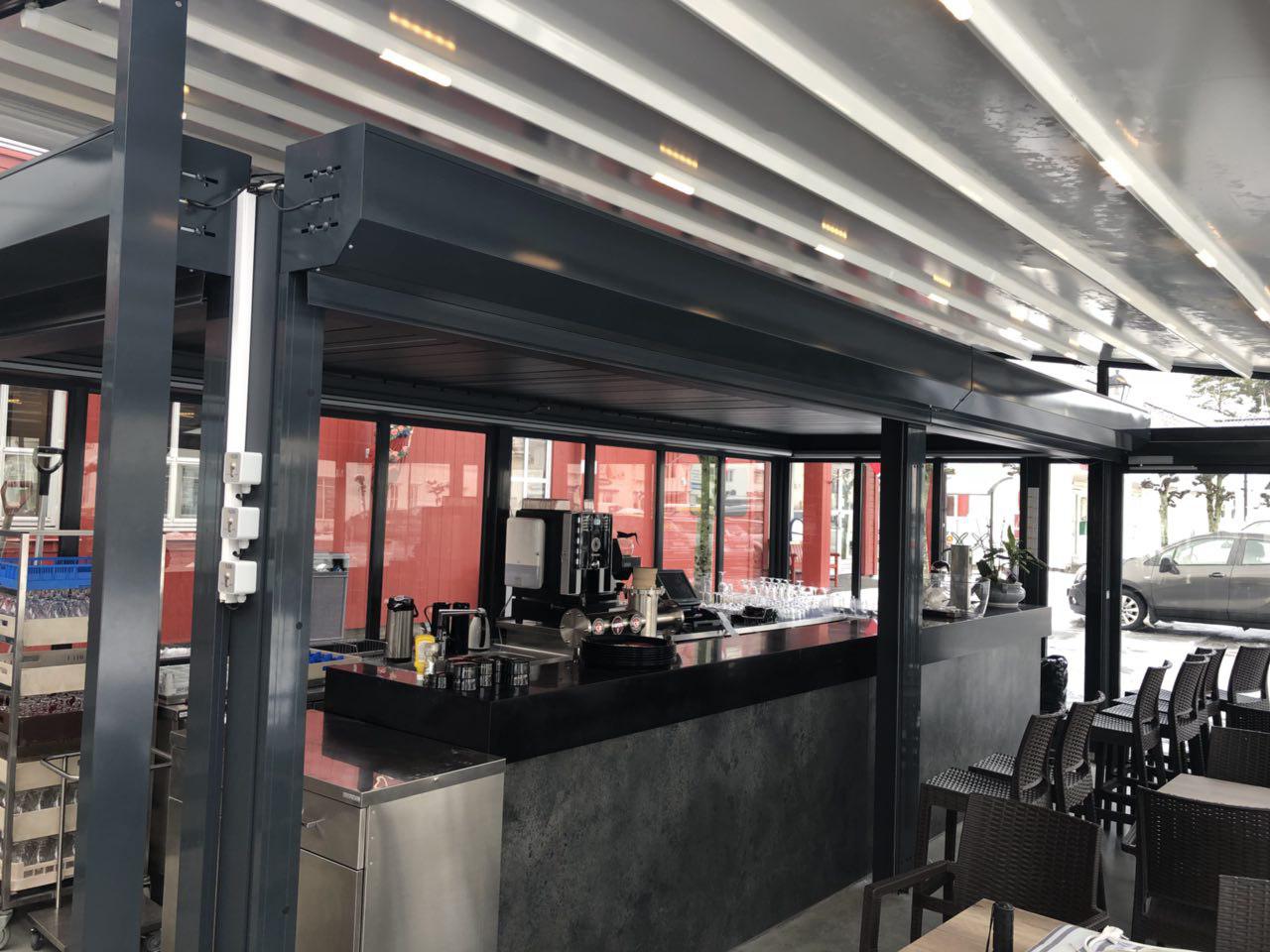 Uteserveringen er svært fleksibel ved at både tak og vegger kan åpnes opp alt etter hvordan været oppfører seg. De store glassfasadene uten markante rammer gjør at besøkende kan sitte på uteserveringen og nyte et bedre måltid og samtidig føle at de sitter ved bryggekanten.