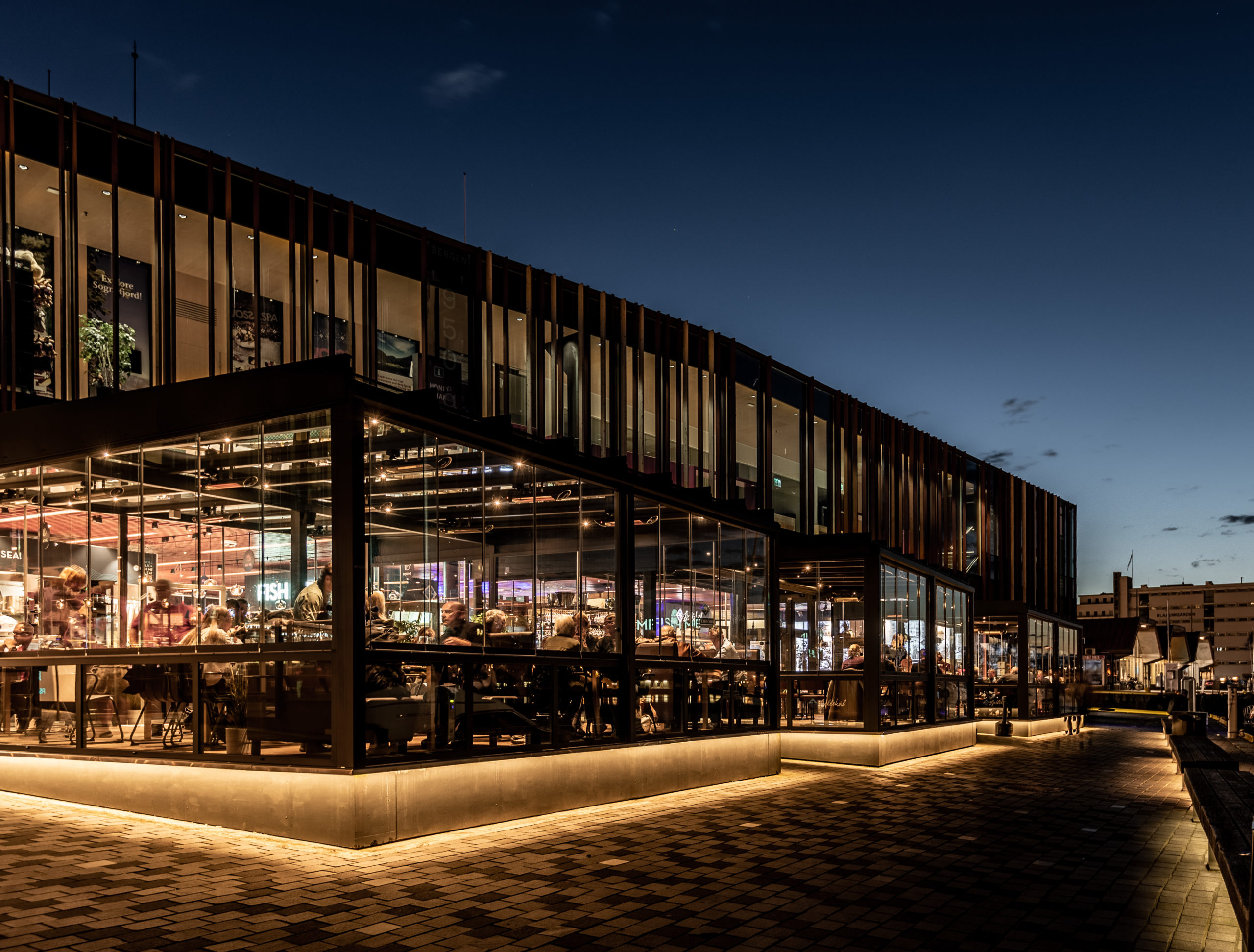 De innglassede glasstakene tar hensyn til utformingen på mathallen på Fisketorget, samtidig som de gir besøkende god skjerming i regnfulle Bergen.