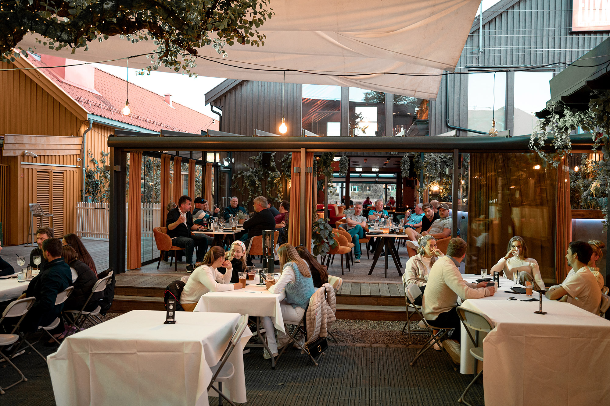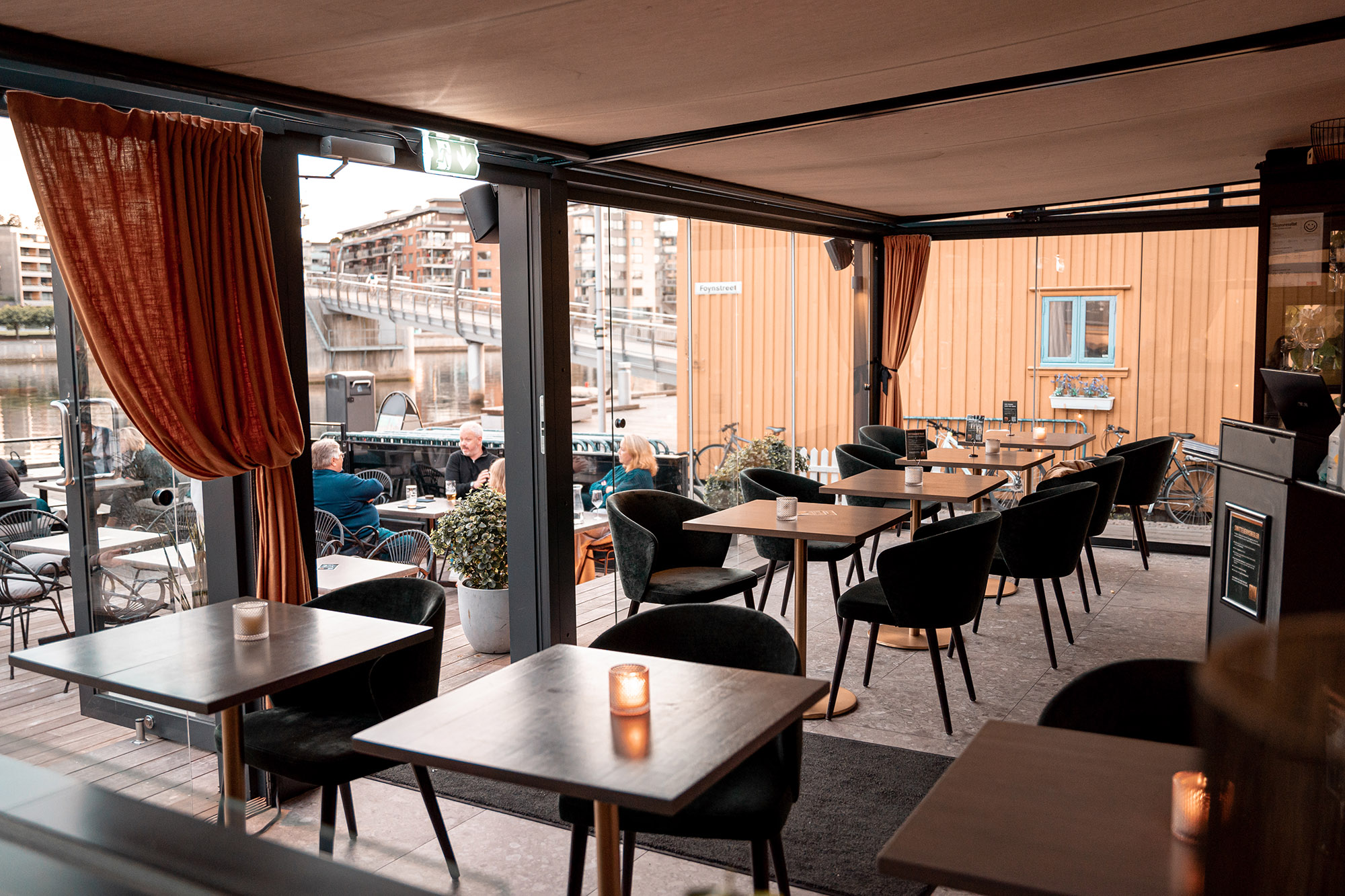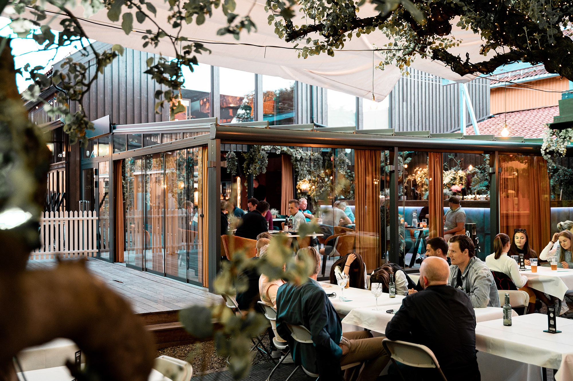 Noe av det mest spenstige med restauranten er hvordan skillet mellom inne og ute enkelt viskes ut. Glasstaket kan åpnes med ett tastetrykk og foldedørene dras til siden sånn at man får en følelse av å sitte inne, men i frisk luft. Skulle solen varme for mye lukkes solskjermingen i taket, også det med hjelp av en fjernkontroll. Fleksibiliteten i produktene bidrar til at både gjester og ansatt får en fin opplevelse når de tilbringer sin tid i Foynhagen.