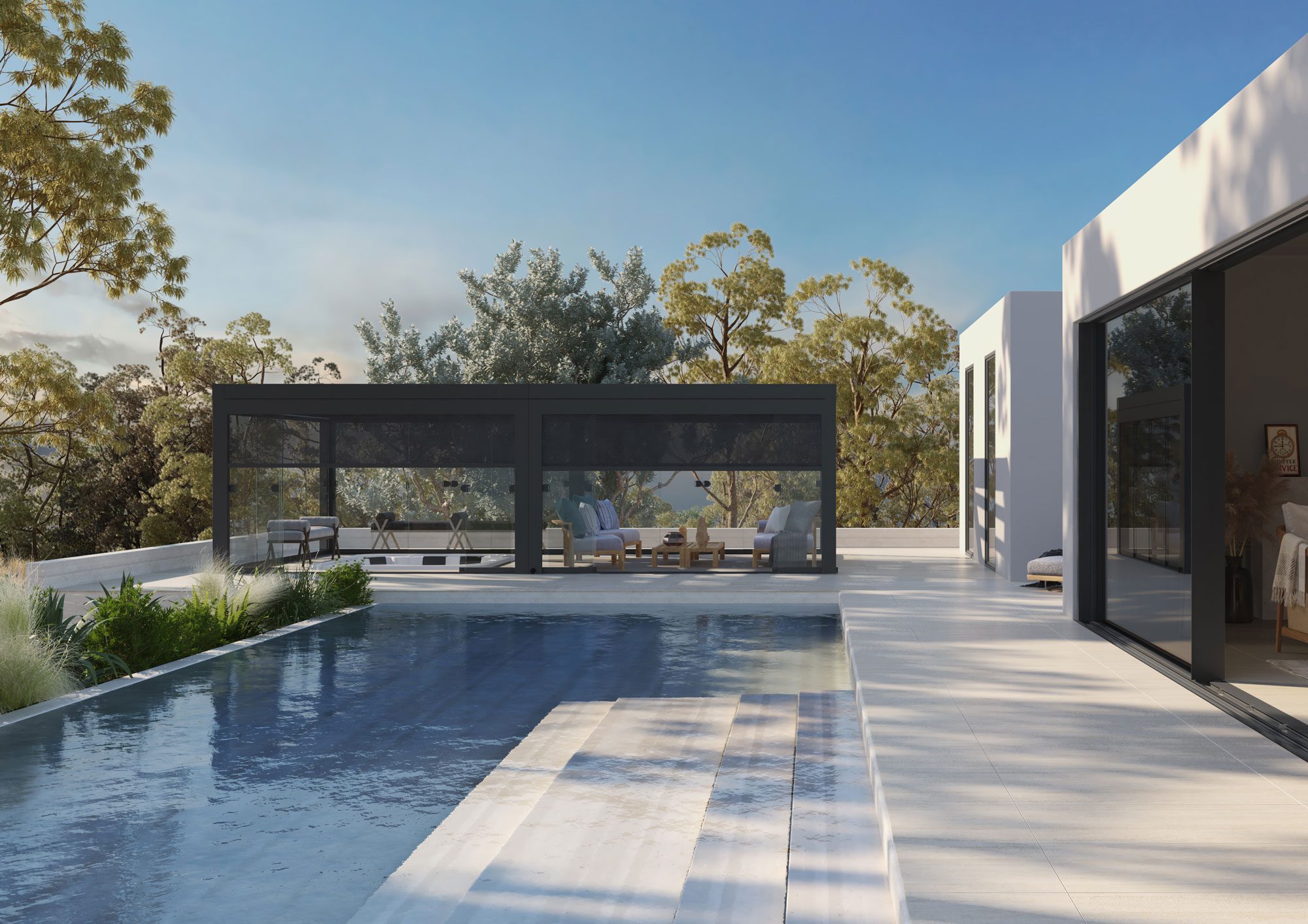 Med muligheter for integrering med 3-veis glass skyvevinduer eller Sunlight vertikale screens, tilbyr denne pergolaen en rekke tilpasningsmuligheter for å møte dine behov.
